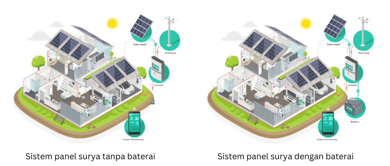 - Off-Grid: Sistem ini beroperasi secara mandiri tanpa terhubung ke jaringan listrik PLN. Biasanya dilengkapi dengan baterai untuk menyimpan energi.